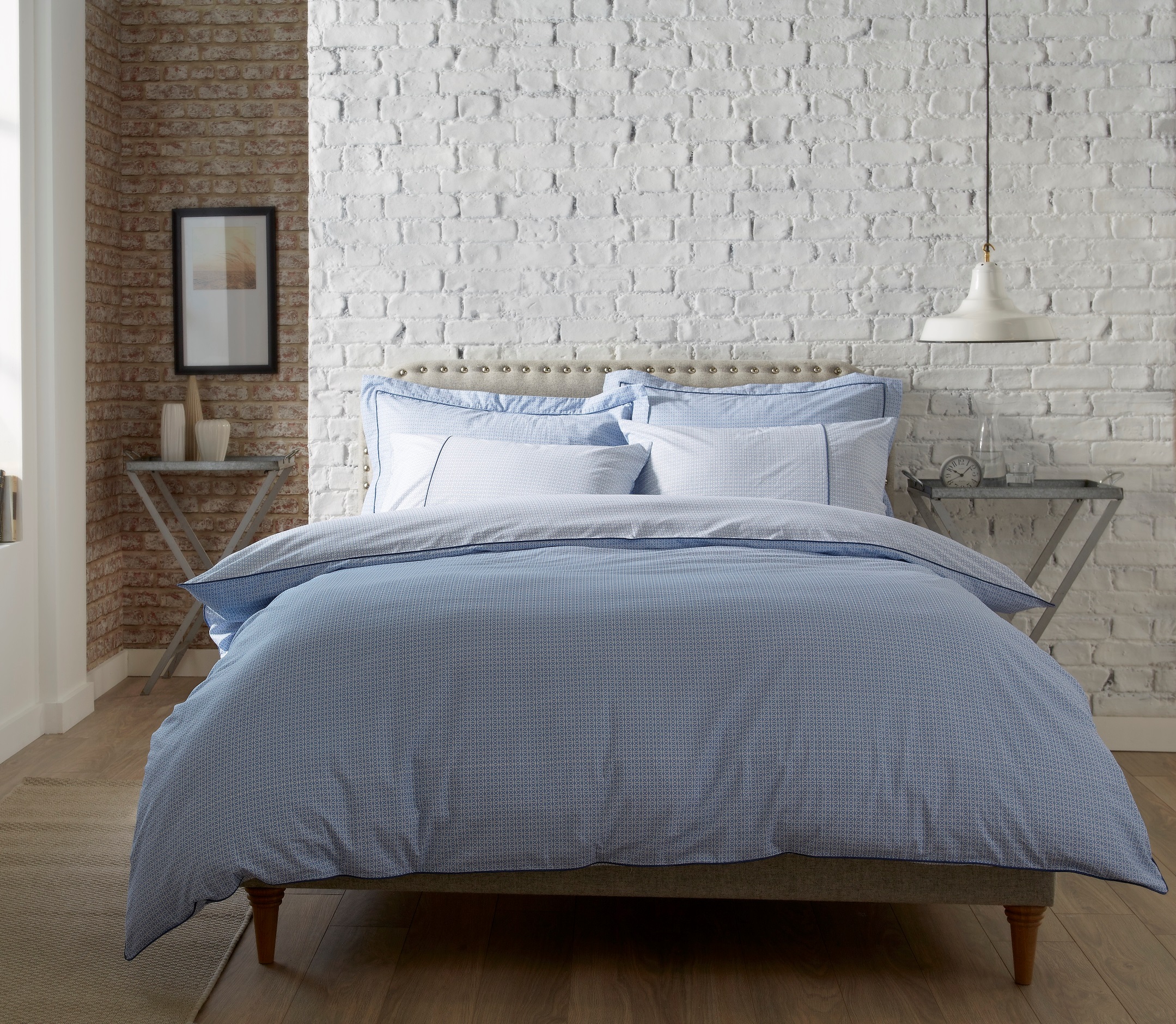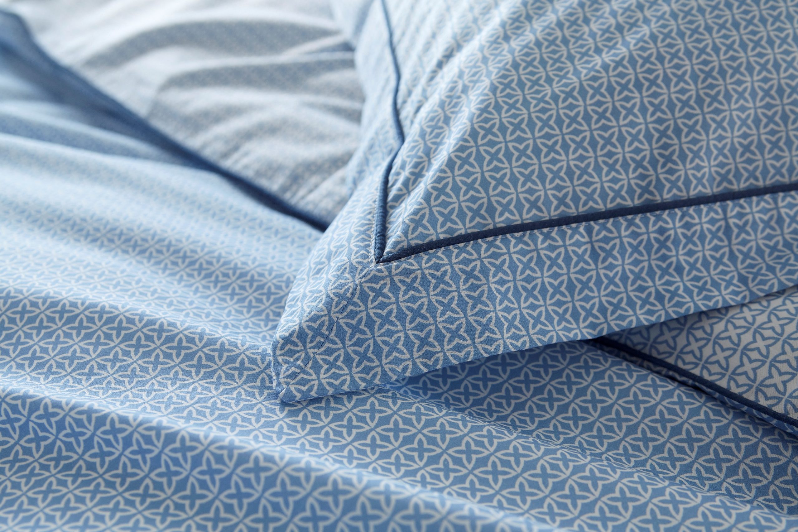 This Astral Blue and white printed bedding is from a contemporary collection of small scale motif designs in a modern colour palette with contrast piping and reverse print details. The 180 thread count 100% cotton percale fabric makes it comfortable as well as stylish.