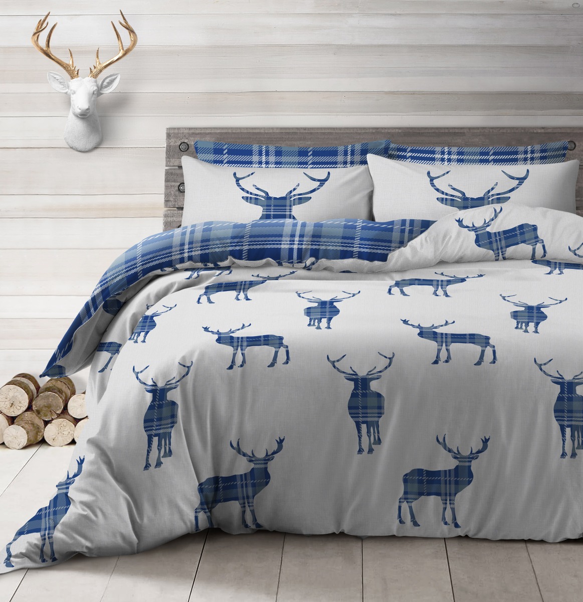 On trend Stag design easy care bed linen with printed stags on one side and a blue check design on the back making this design fully reversible.