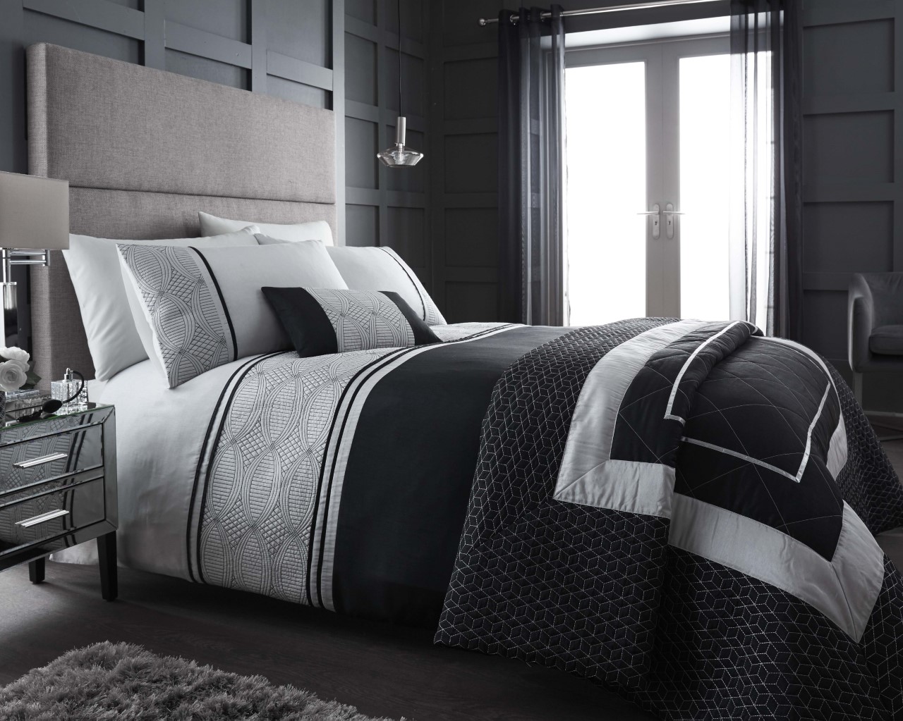 Caravan Shaped Black & Silver Embroidered Duvet Cover Set, Quilted Throw & Boudoir Cushion