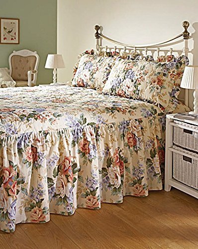 Hotel quality traditional bedspread with a scalloped effect quilted top and gathered 22″ (55cm approx) deep side valance. A lovely floral print on a biscuit beige background. Also available in 4 plain colours and a range of other floral prints.