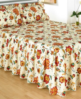 Hotel quality traditional bedspread with a scalloped effect quilted top and gathered 22″ (55cm approx) deep side valance. A lovely traditional print on a rich cream background. Also available in 4 plain colours and a range of other floral prints.