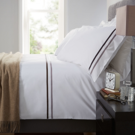 Create the boutique hotel look in your own home. Kensington is a timeless luxury bedding range that combines clean fresh white linen with a classic double row two-tone grosgrain 1cm wide ribbon trim in grey. This collection is made from a high quality 200 thread count cotton percale that feels smooth and crisp with a subtle and stylish applique design detail.