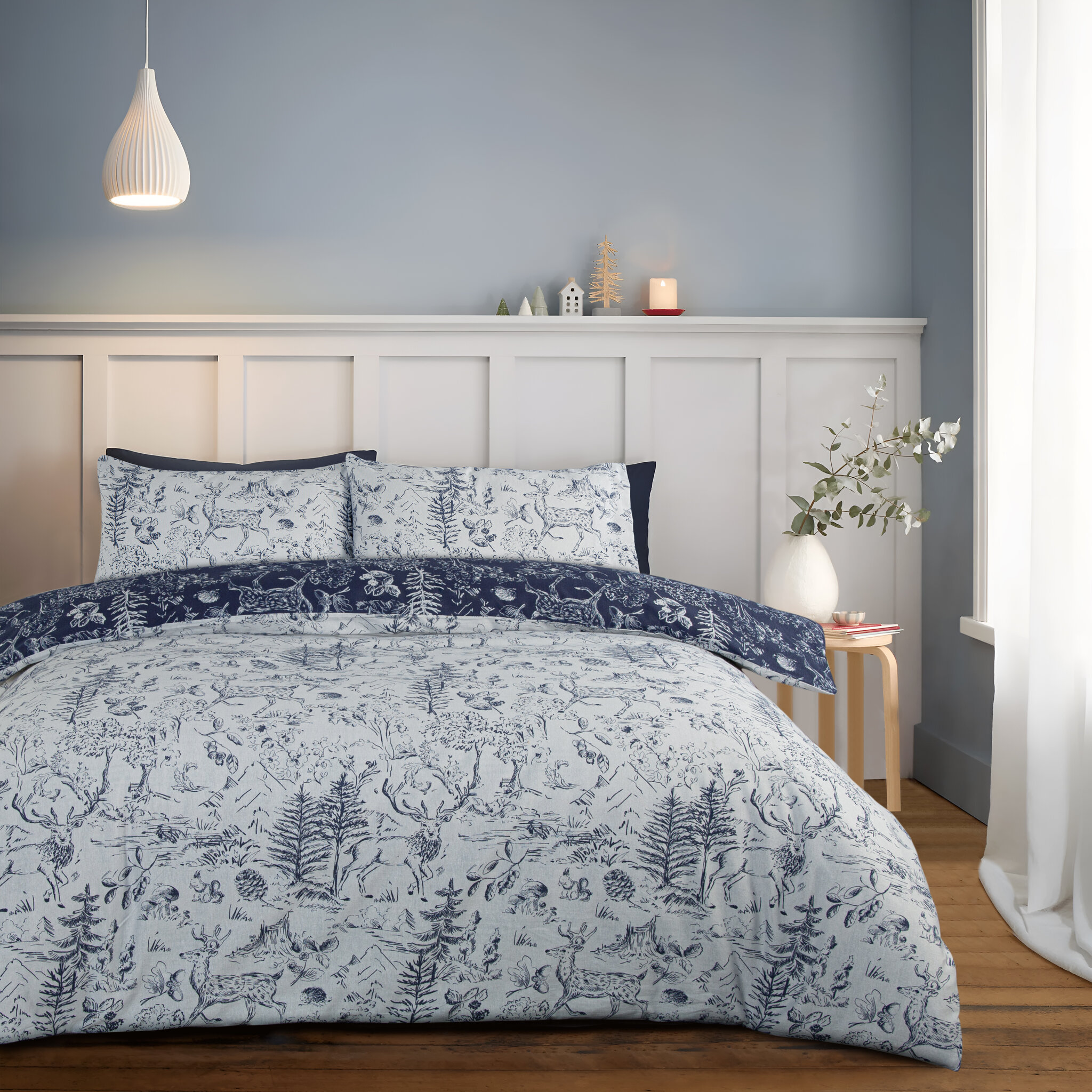 Majestic stags frolic with squirrels and hedgehogs to create this woodland forest scene. Crafted from softly brushed polycotton for long lasting comfort.