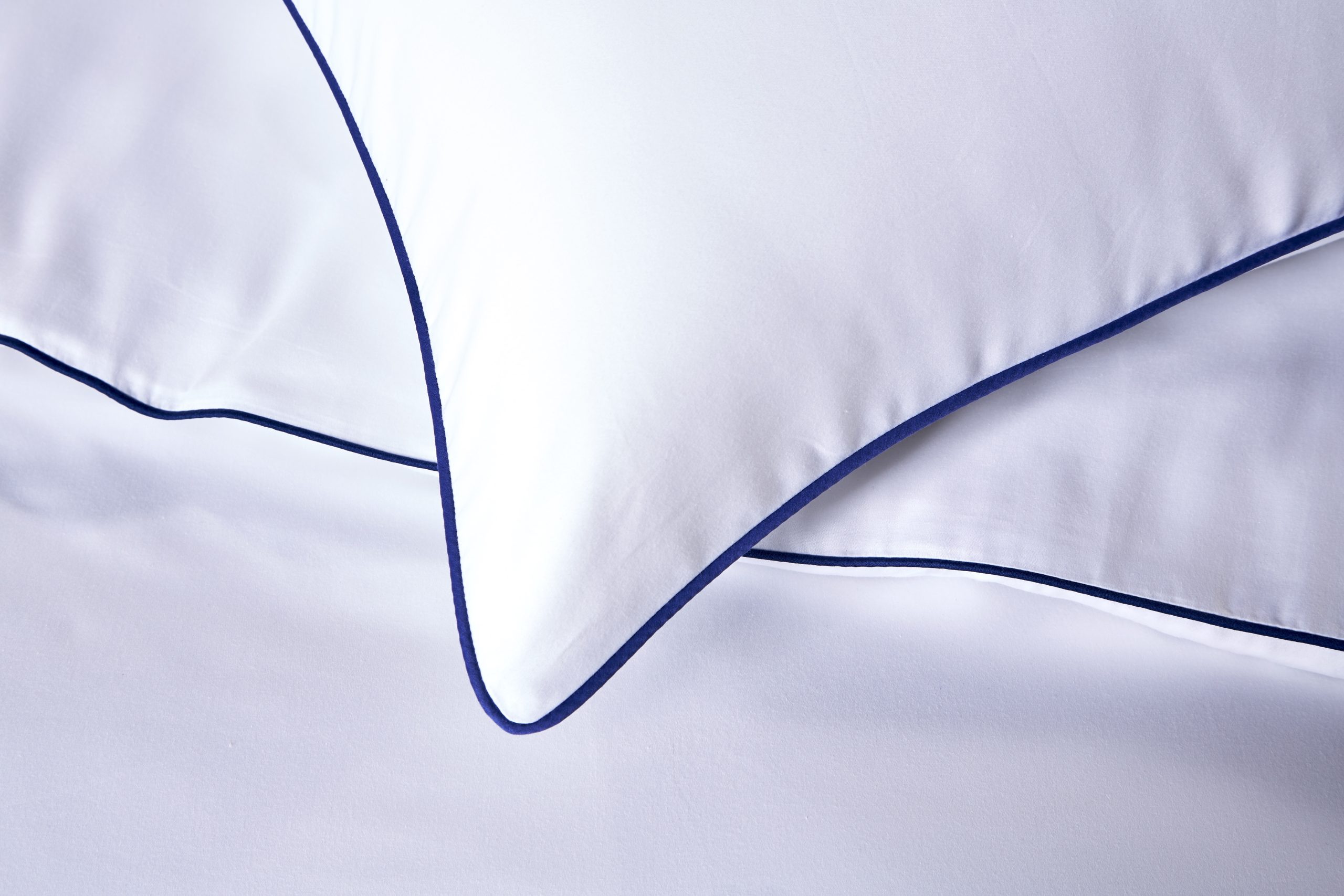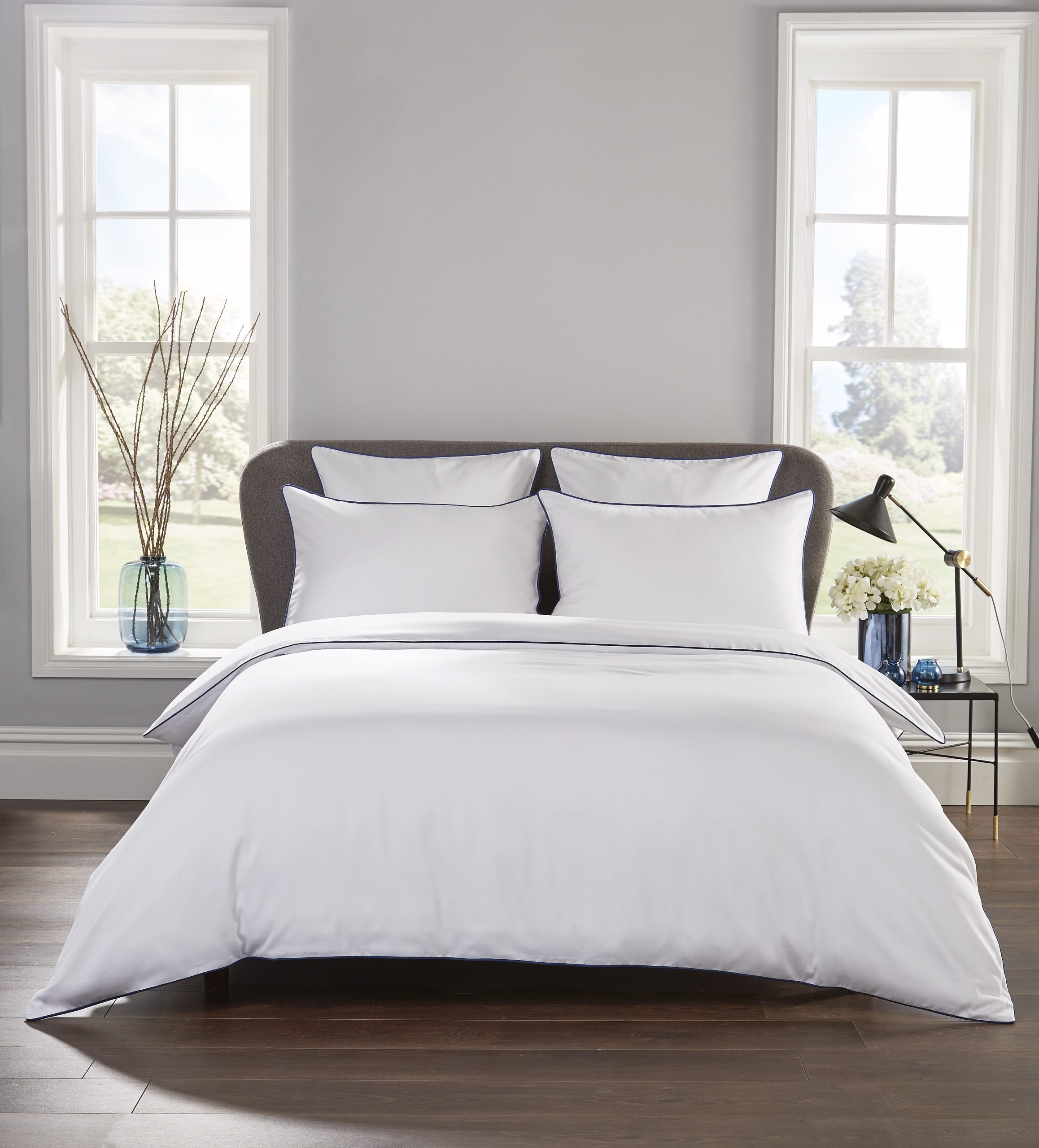 This simple, timeless and elegant  white 100% cotton duvet cover and pillowcase set with contrasting navy piped edge is made from luxury 400 thread count single ply cotton – celebrated for its superior strength, durability and exquisite comfort. It has a  smooth sateen finish and feels wonderfully soft against your skin. Each set includes a navy blue piped edge duvet cover with button fastening and Housewife style pillowcases to match.