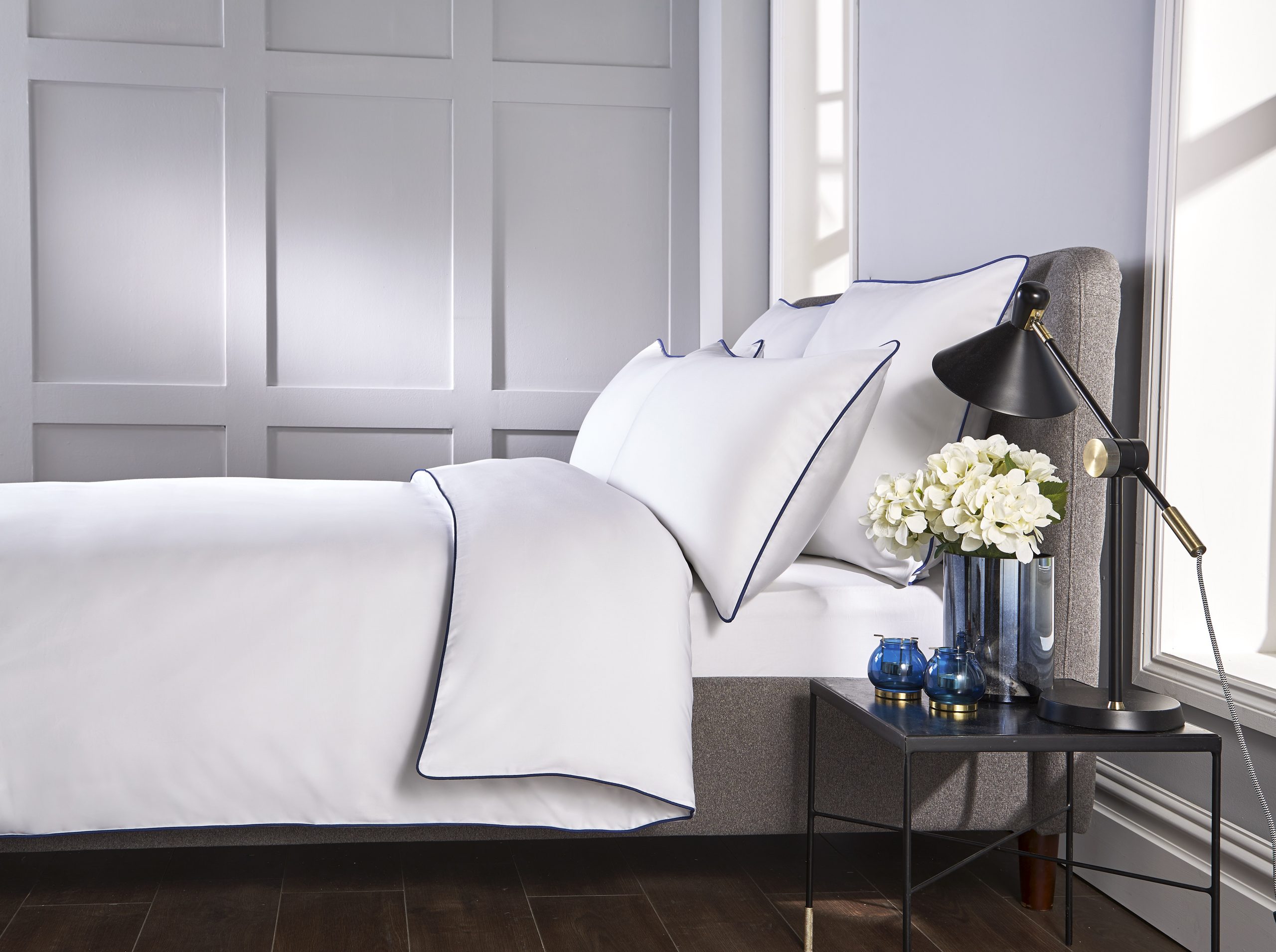 The duvet cover and pillow cases have a navy blue contrasting piped edge finish.