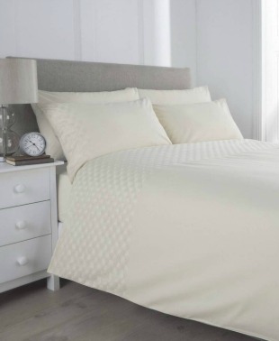 Stylish duvet cover set in plain cream with an subtle embroidered self coloured art deco shell pattern panel on both the duvet cover and pillowcase.
