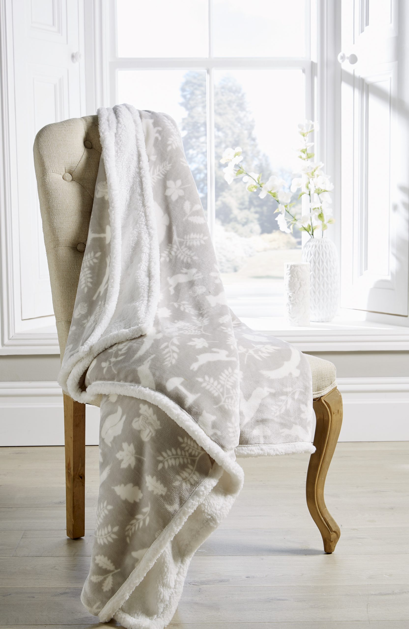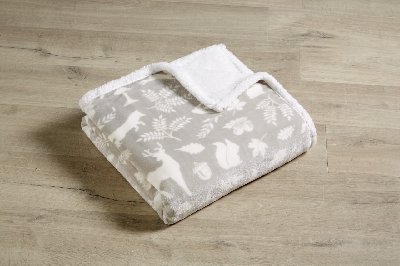 This Woodland print silver grey plush fleece throw has a soft and fluffy plain white sherpa fleece reverse. It will make a welcoming extra blanket on the bed on cold nights or a warm wrap to snuggle on the sofa when reading or watching tv. Ideal as a picnic blanket too.