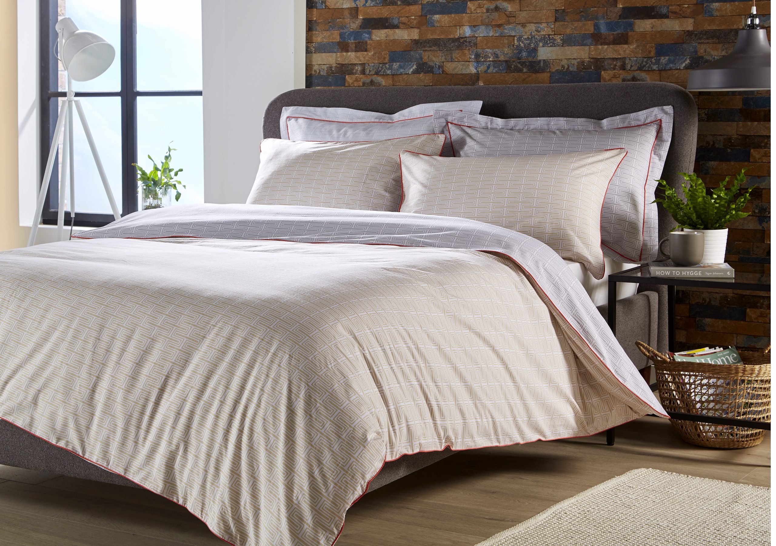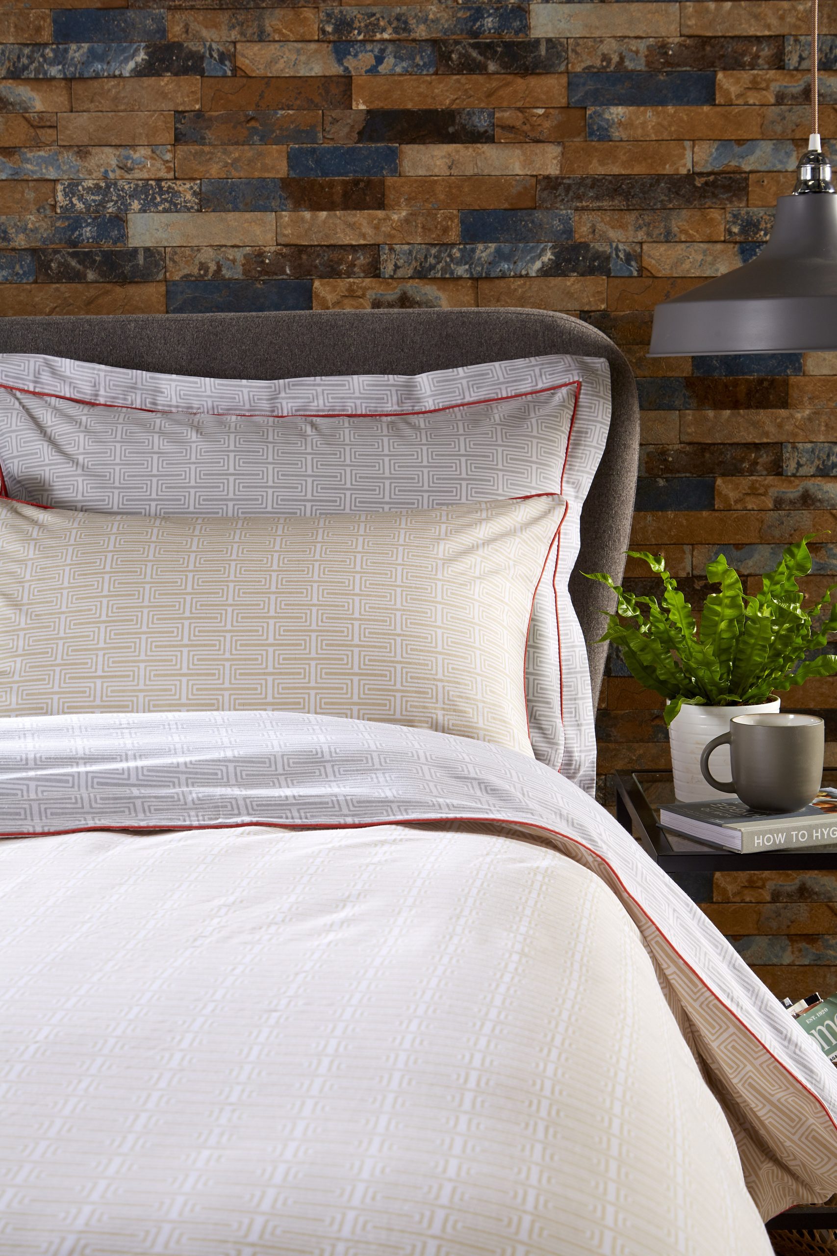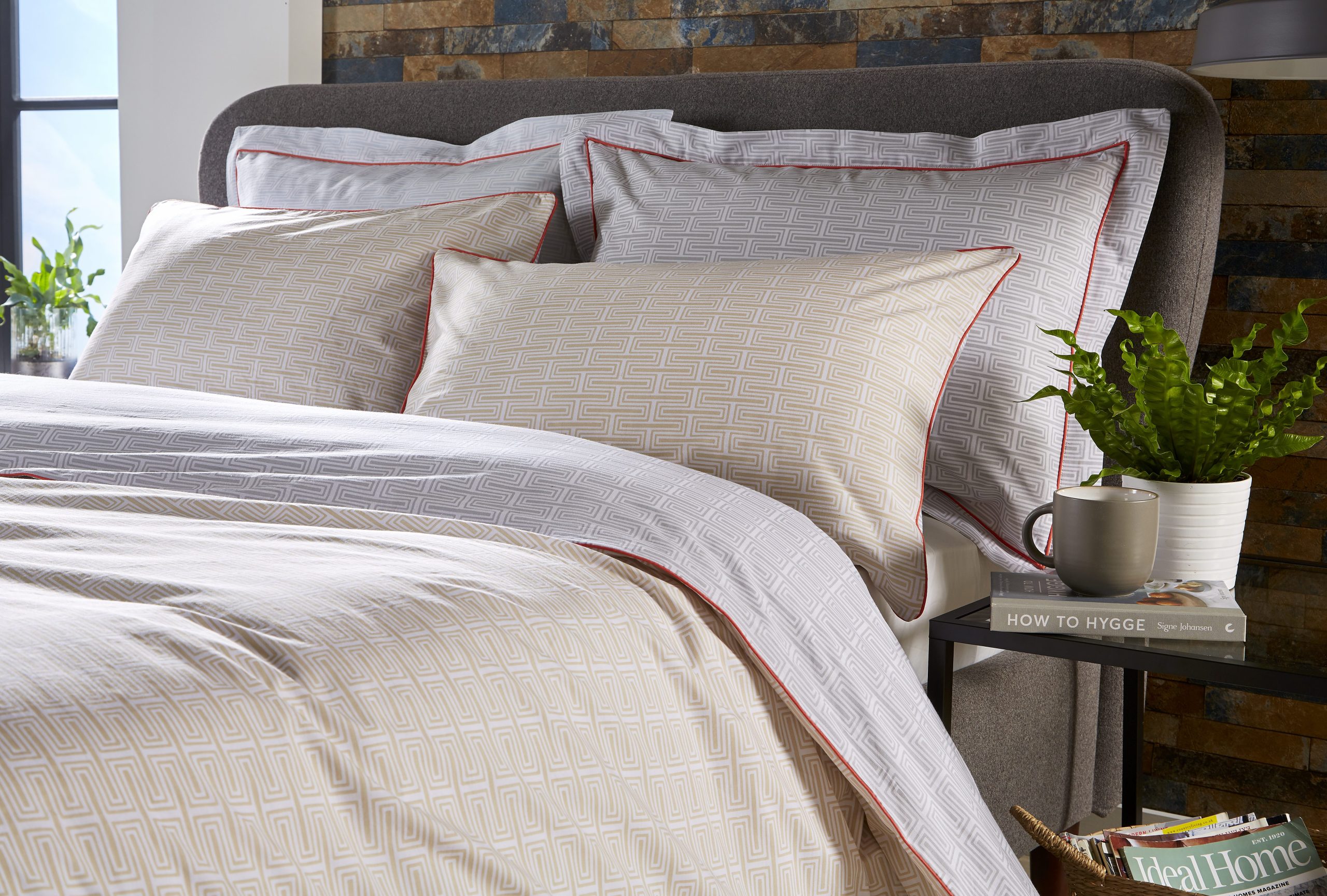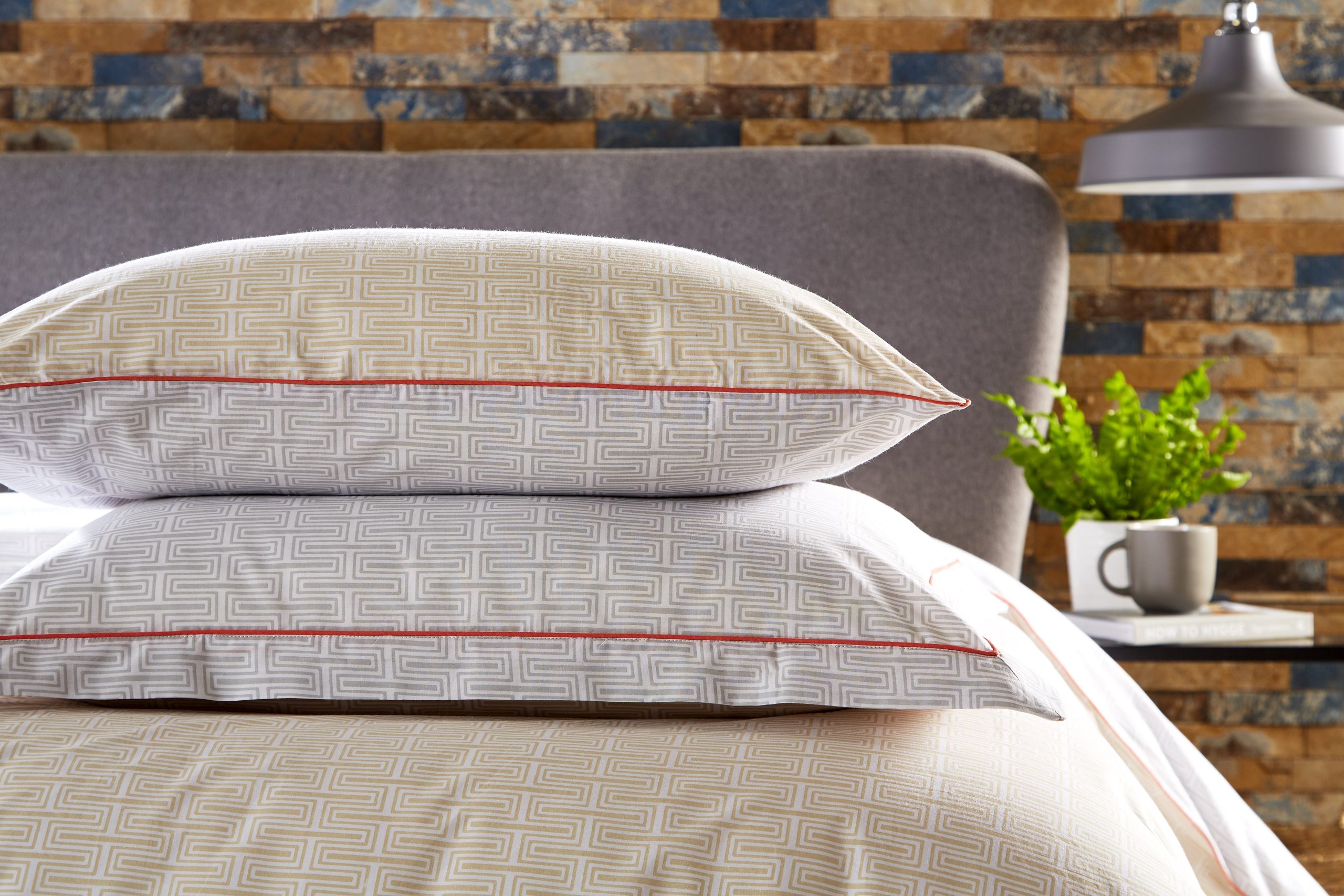 The Milo white, grey and mustard printed bedding is from a contemporary collection of small scale motif designs in a modern colour palette with contrast piping and reverse print details. The 180 thread count 100% cotton percale fabric makes it comfortable as well as stylish.