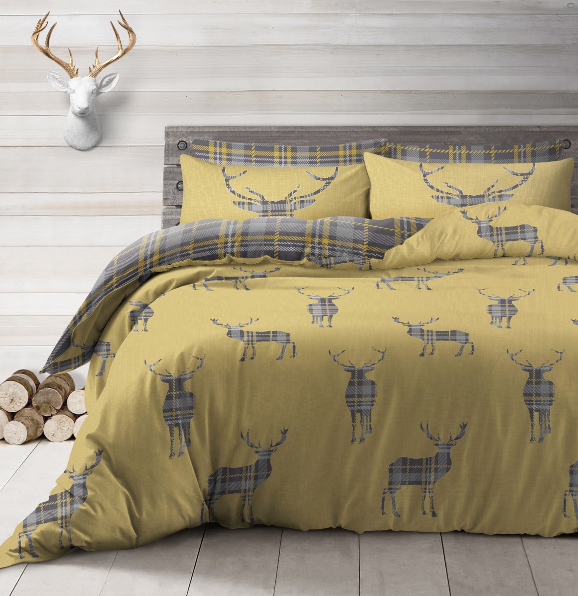 On trend Stag design easy care bed linen with printed stags on one side and a Ochre check design on the back making this design fully reversible.