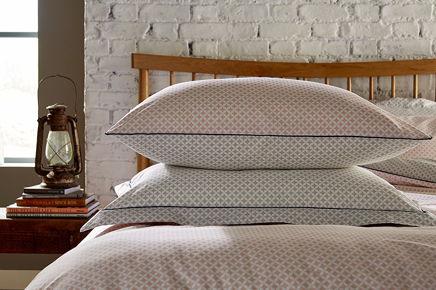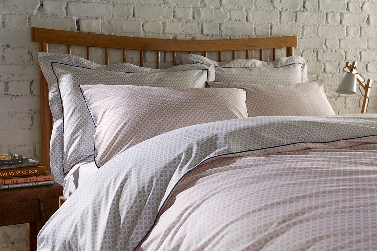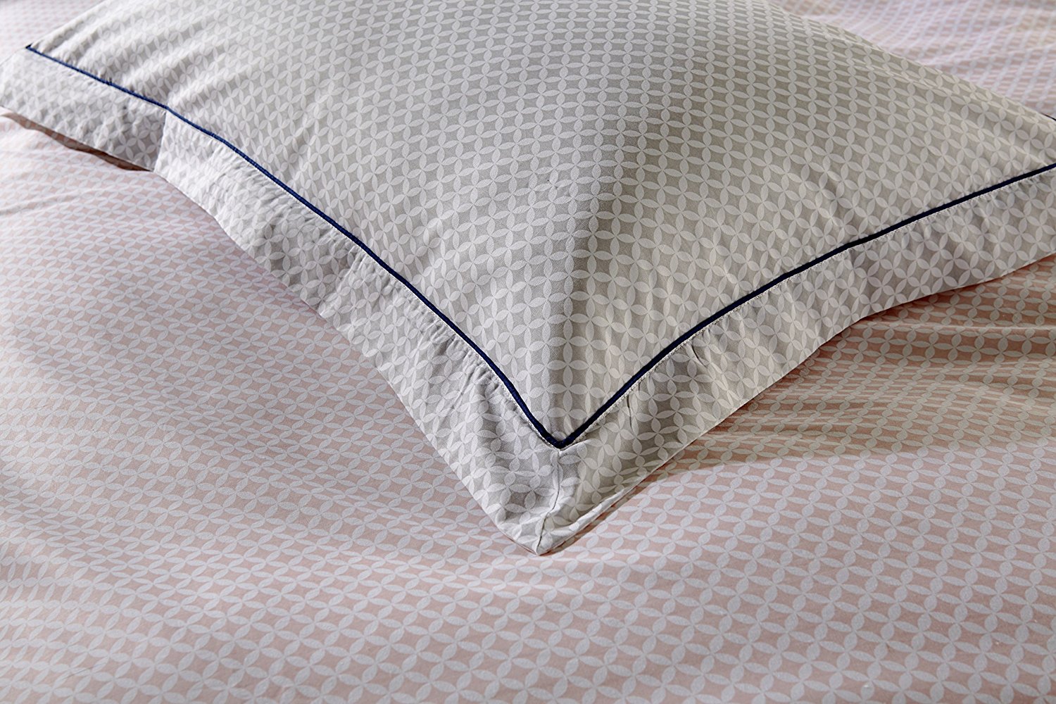 Pink/White/Grey geometric reversible 180 thread count 100% cotton duvet cover set  from a contemporary collection of  printed designs featuring small scale motif designs with contrasting piping detail.
