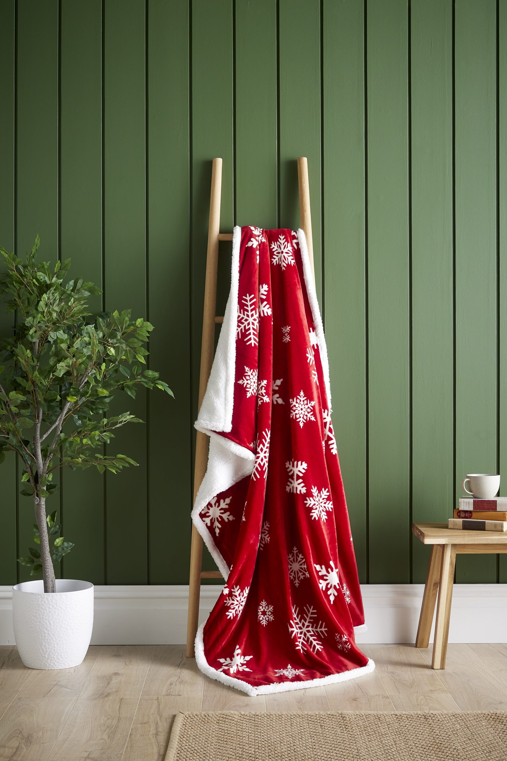 This Red/White Snowflake design plush fleece throw has a soft and fluffy plain sherpa fleece reverse. It will make a welcoming extra blanket on the bed on cold nights or a warm wrap to snuggle on the sofa when reading or watching tv. Ideal as a picnic blanket or Christmas gift.