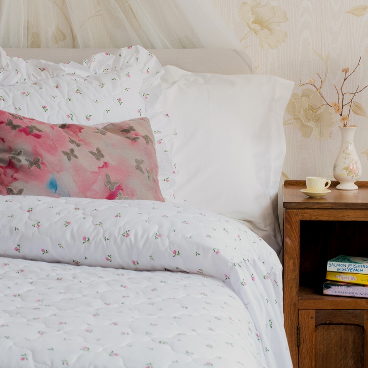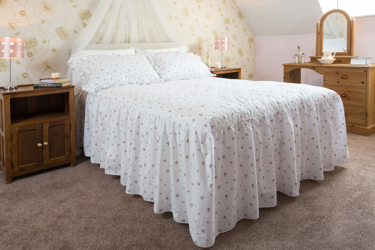 Hotel quality traditional bedspread with a scalloped effect quilted top and gathered 22″ (55cm approx) deep side valance. Matching pillowshams included. A lovely delicate pink and green rosebud print on a white background