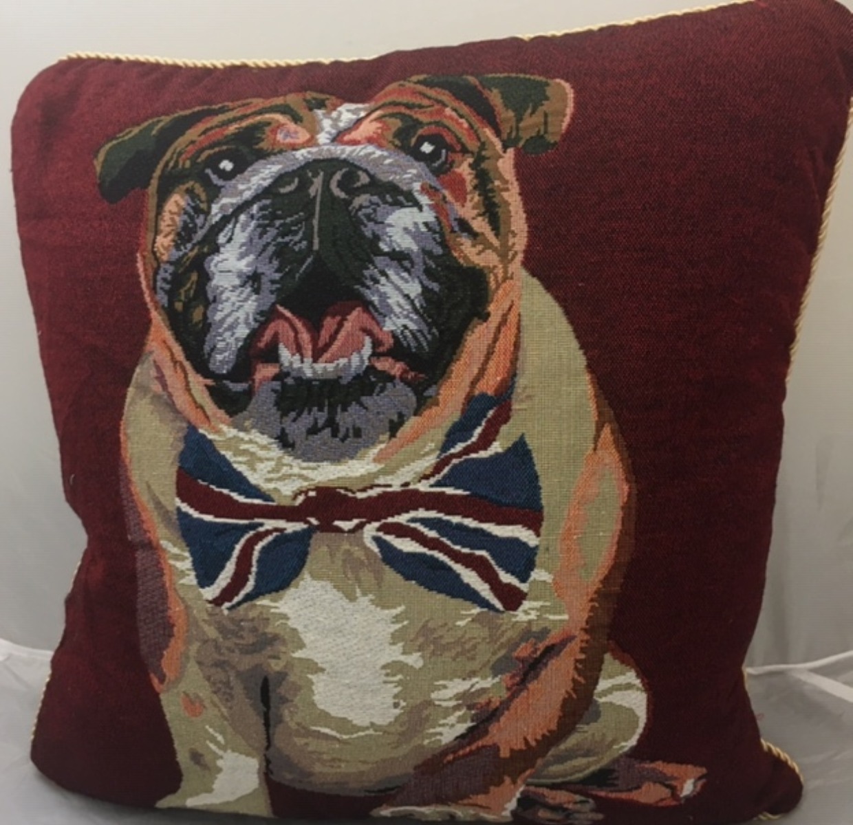 Beautiful tapestry style woven British Bulldog design one side with plain co-ordinating velvet reverse and luxury braided rope trim.
